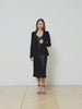 An effortlessly chic knit blazer in black. Classic tailored details like lapels, shoulder pads, and patch pockets complement soft, luxurious knit done in a lightly textured stitch. Clean silhouette tapers at waist for a flatteringly sleek fit. Tonal embossed-dome button closure.