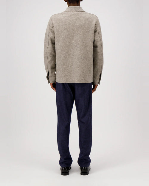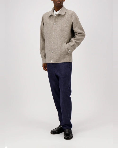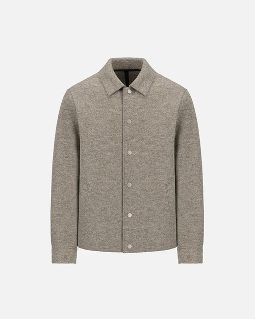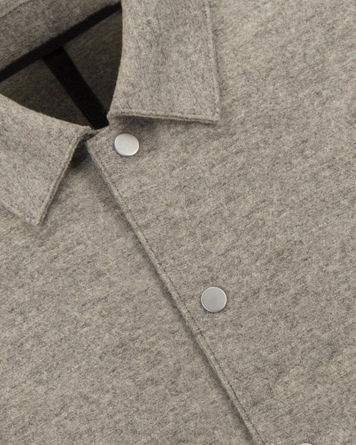Coach jacket, unlined in knitted felted wool.Single-breasted long jacket, straight shape, featuring welt pockets, 6 snap button fastening, shirt collar and buttoned sleeve cuff. Raw-edge finish. Made in Italy with Italian fabric.