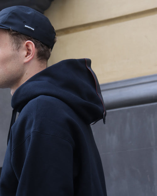 Relaxed fit hoodie, crafted from a heavy weight cotton sweat shirting. Featuring dropped shoulders, drawstring hoodie with detailling, long sleeves, front nylon kangaroo pocket with snap closure and ribbed hem and cuffs.