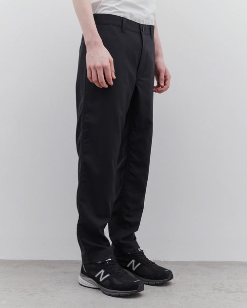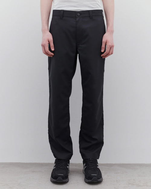 Relaxed fit trousers, cut from a wool gabardine. Featuring a tailored waistband, belt loops on waistband, concealed zip fly, button closure at waist, straight legs, side slant pockets at front, and buttoned welt pockets at back.