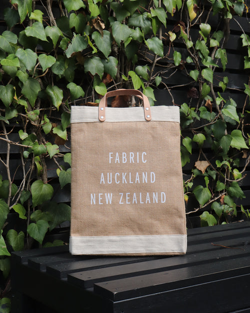 The APOLIS + FABRIC Auckland New Zealand Market Bag is sold exclusively at FABRIC. Featuring waterproof interior lining, vegetable dyed leather straps and Antique nickel rivets. On einterior pocket, emrboidered logo and heart detail on outside.