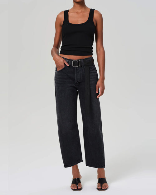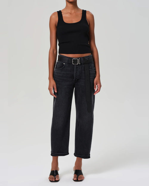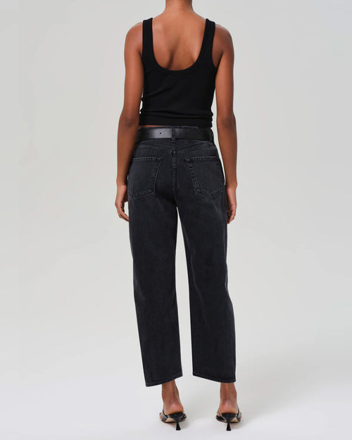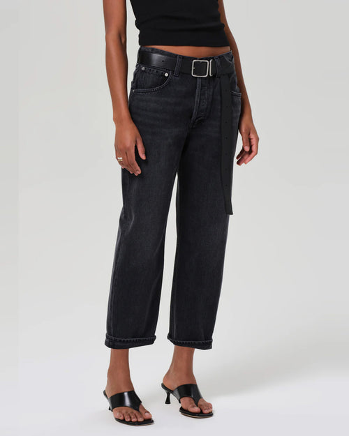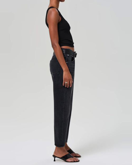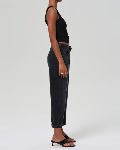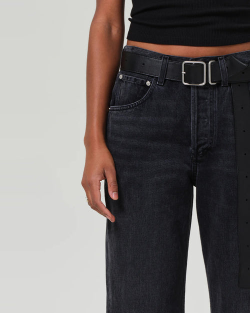 Relaxed fit jean, cut from a regenerative denim. Featuring a mid rise that is intended to be worn low slung on the hip, baggy wide legs with slight curve, uneven baby rolled cuff that can be un-rolled, button fly, and classic 5 pocket denim detailing.