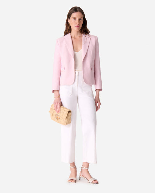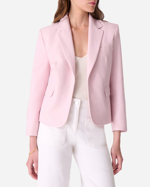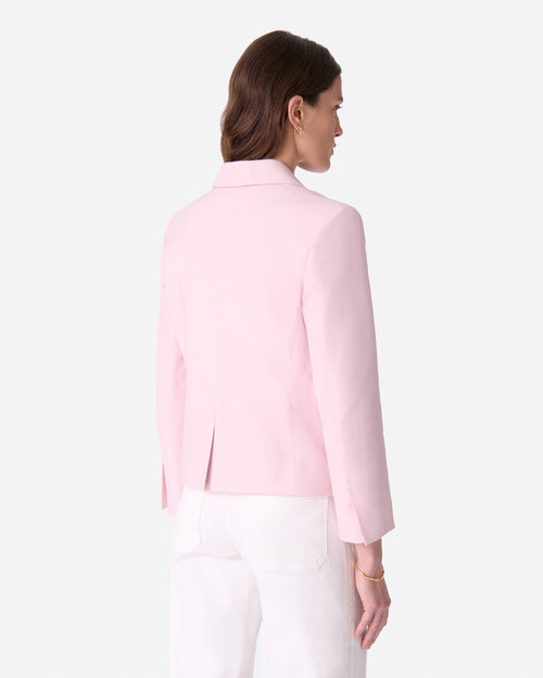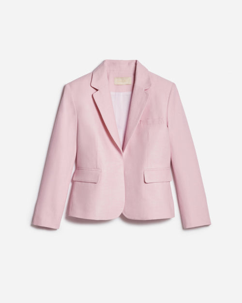 Vanessa Bruno's Emna is a single-breasted blazer in a pink blend of cotton, linen and viscose. With a fine, light structure and classic lapels, it has a slim fit, slightly cropped sleeves and shoulder pads.