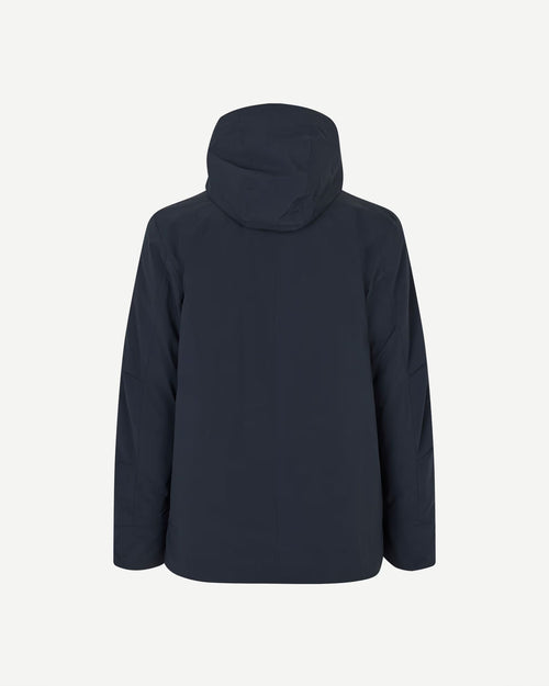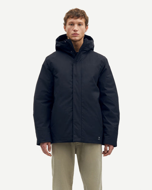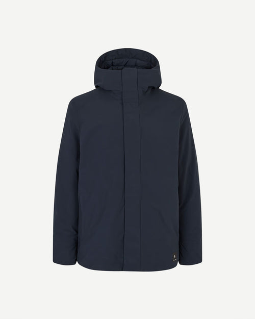 Jacket with a regular fit and drawstring hood. Hidden zipper and press button closure on the front. Zipped side slit pockets on the front. Rib-knitted cuffs on the inside. Patch with Samsøe Samsøe branding at the hem. Waterproof taped seams. Padded with Thermore® EcoDown. Main lining made from mini ripstop. Waterproof main material made from 100% recycled polyester. This product is GRS certified. Each stage of the supply chain has met strict social, environmental, and chemical requirements.