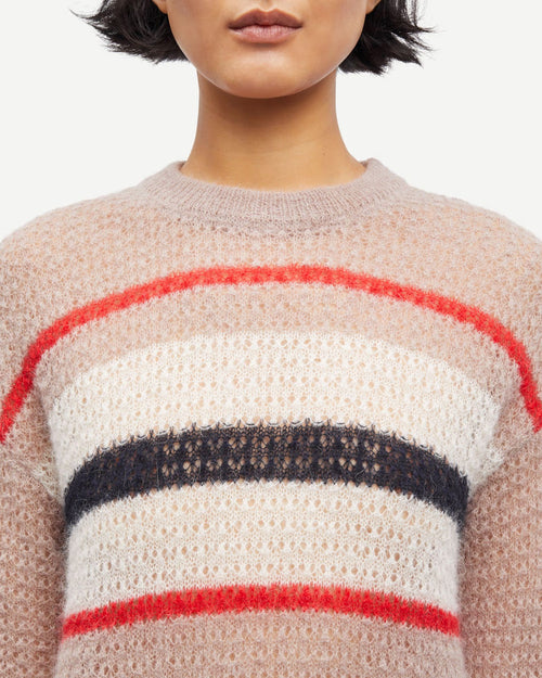 Pointelle-knitted sweater with a loose fit. Rib-knitted collar, cuffs, and hem. Crew neck. Main material made from a blend including mohair and superfine alpaca wool.