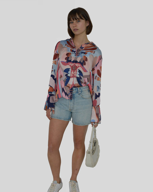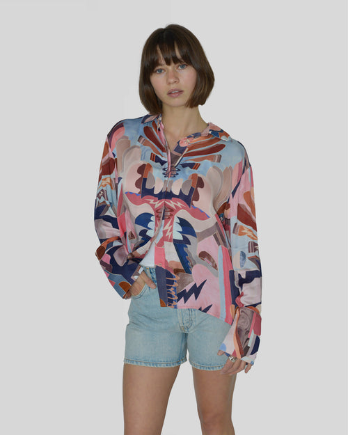 The Viggo Shirt is made from cupro satin in our Art Deco-inspired Luka print. Cut for a loose fit, it has a shirt collar, back pleat for added volume, and fabric buttons on the front and cuffs. Pair it with the Viggo Pants for an eye-catching evening look.